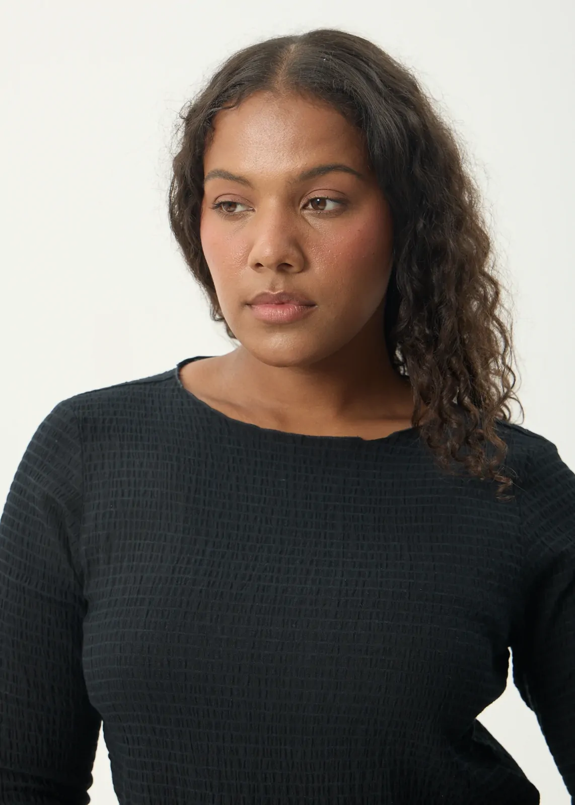 The Focus Seersucker Long Sleeve Top is designed to sit comfortably through the body, with a soft drape and an easy, everyday feel. The boat neckline creates a clean, open shape through the shoulders, while the slightly flared sleeves add movement without feeling overdone.