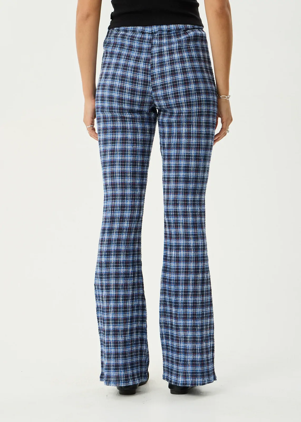 The Mountains Seersucker Flare Pant is designed to sit comfortably through the waist and hips before falling into a soft, flattering flare. The semi-fitted shape keeps things clean through the top, while the textured fabric adds interest without feeling overworked.