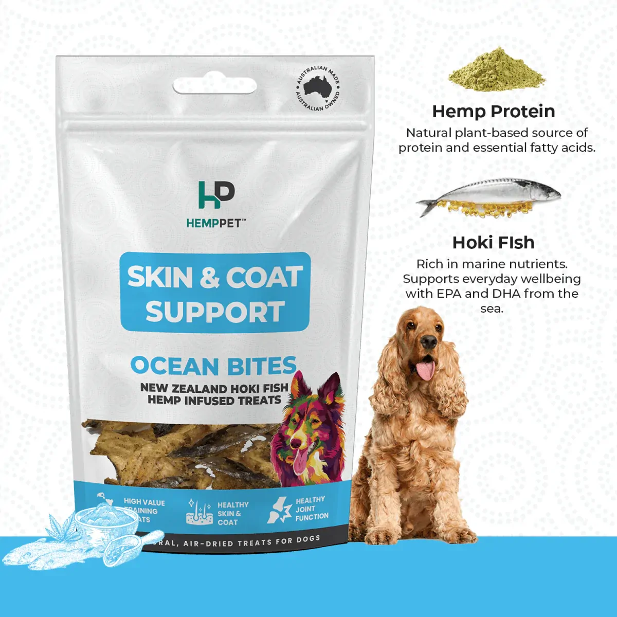 Skin & Coat Support | New Zealand Hoki Fish Hemp Infused Treats for Dogs 70g In Stock