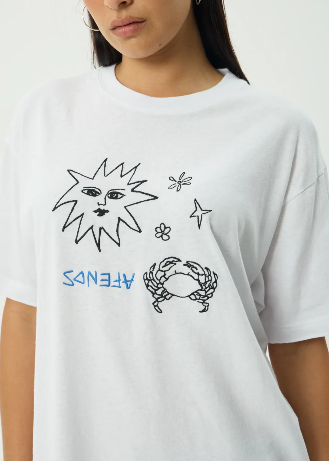 Crafted from a soft, breathable hemp–cotton blend, this oversized tee features custom embroidered artwork inspired by astrology and summer skies. Think radiant suns, playful crabs, and free-floating cosmic motifs stitched in contrasting tones — all designed to add a touch of personality to your laid-back staples.