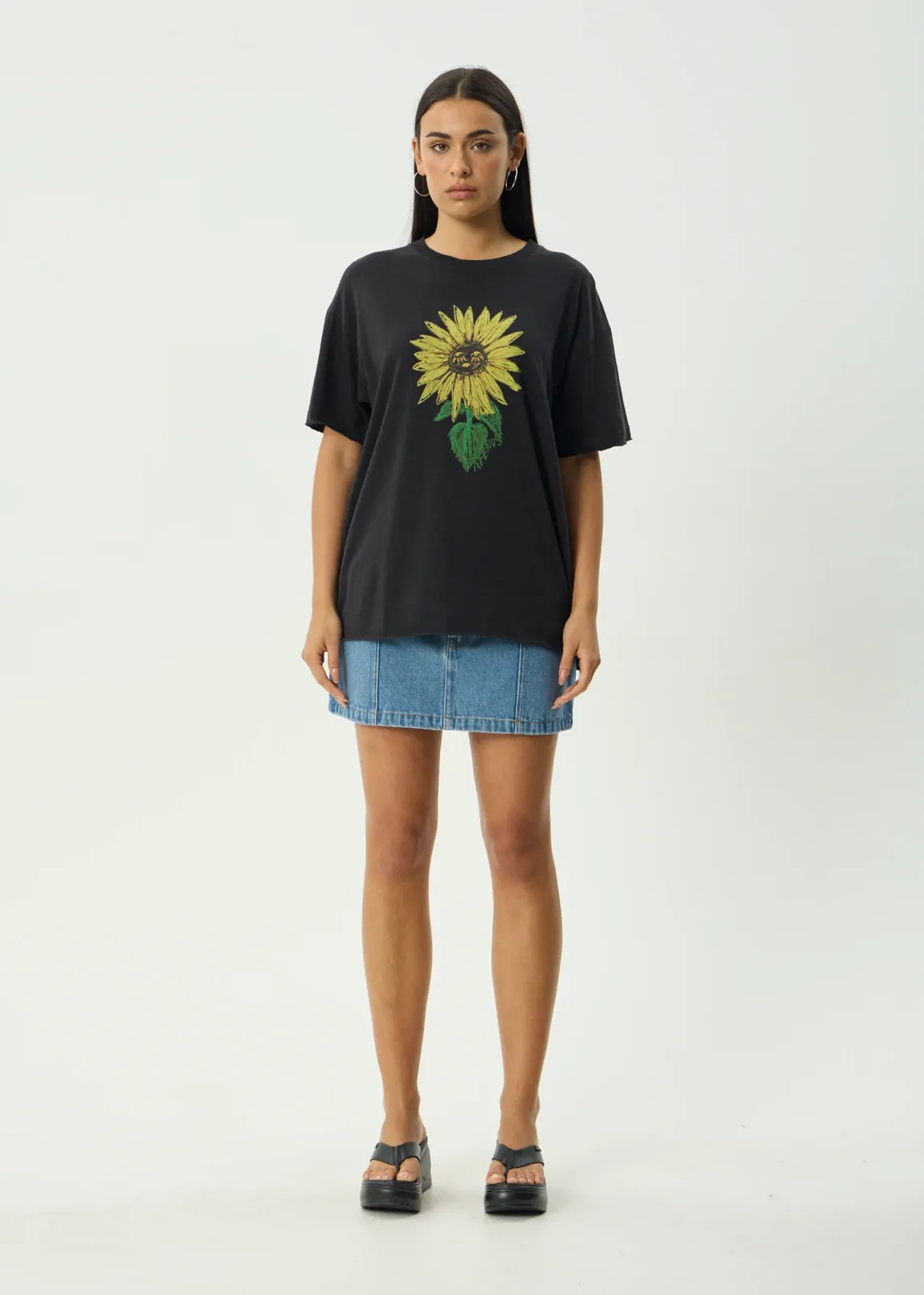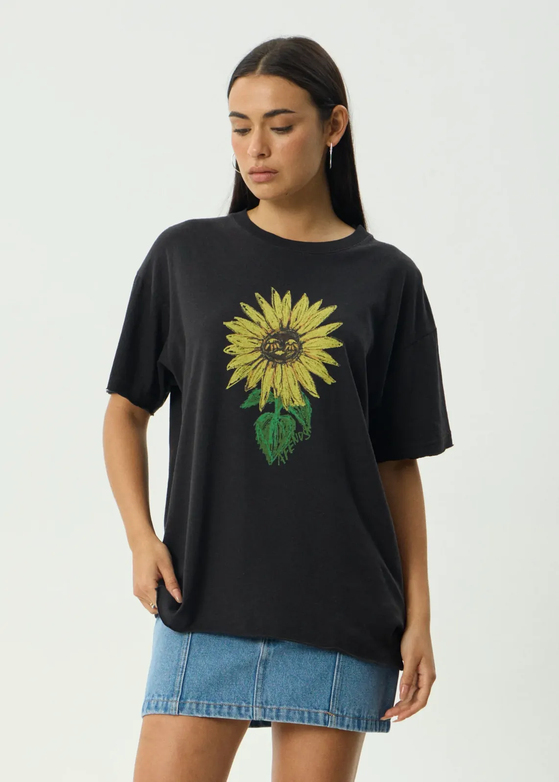 The front features a custom oil-pastel sunflower illustration, adding a nostalgic, hand-drawn charm that pops against the black base. With a ribbed crew neckline, double raw-edge hem and relaxed oversized fit, it’s the ideal throw-on tee for slow mornings, beach days or laid-back evenings.